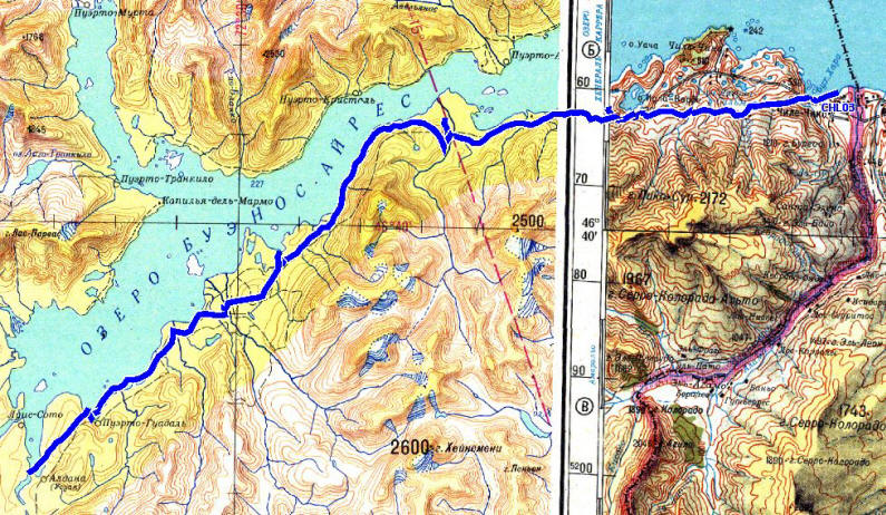 | Beschaffenheit | Nach Chile Chico handelt es sich um eine sehr schlechte Piste, die im Verlauf dann besser wird. Die Route führt an der Südseite des Lago General Carrera entlang. Einige Abschnitte sind unmittelbar oberhalb des Sees in den Fels gebaut. Andere Abschnitte führen mehr oder weniger steil bergauf oder bergab. Hier muss man besonders langsam fahren, denn an den Steigungen tritt vermehrt starkes Wellblech auf, wo man dann auf die Bodenhaftung achte muss. Außerdem ist hier Schwerlastverkehr unterwegs, den man wegen des kurvenreichen Verlaufes der Piste oft erst im letzten Moment erkennt. |